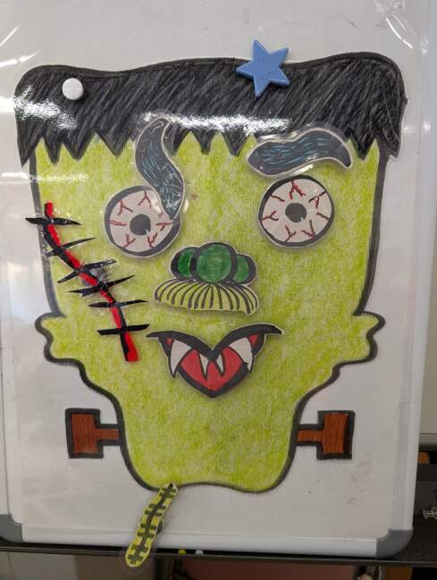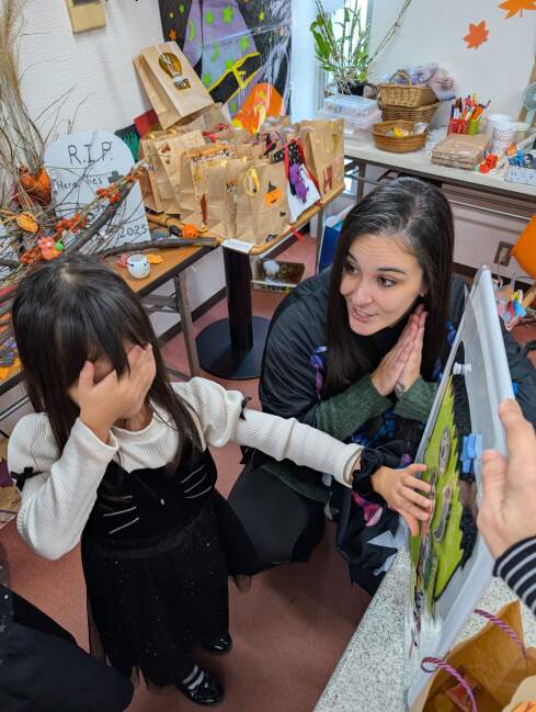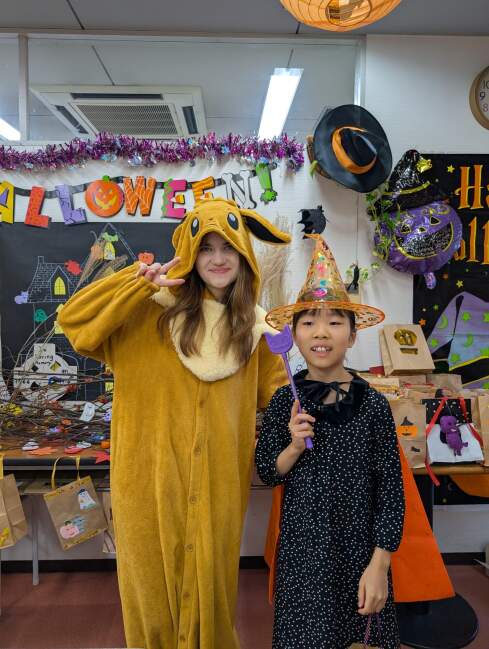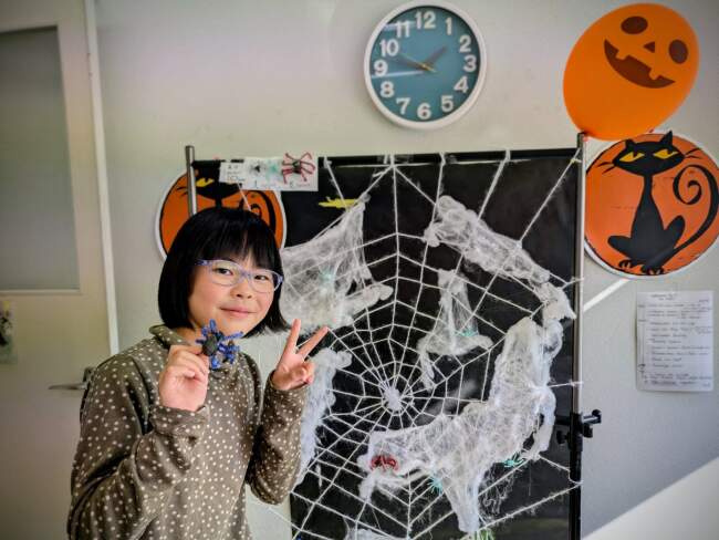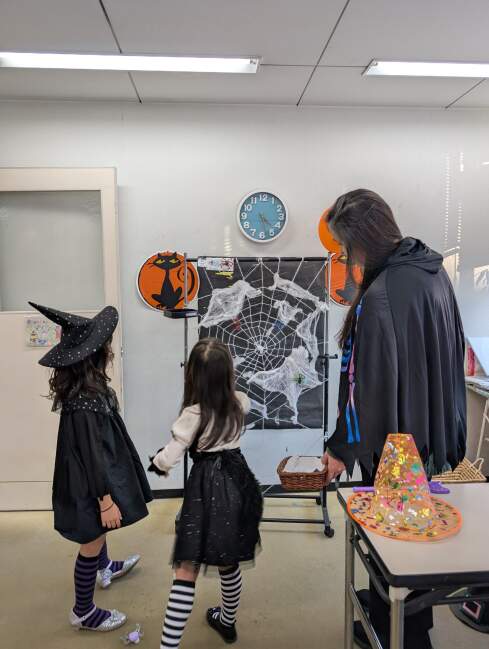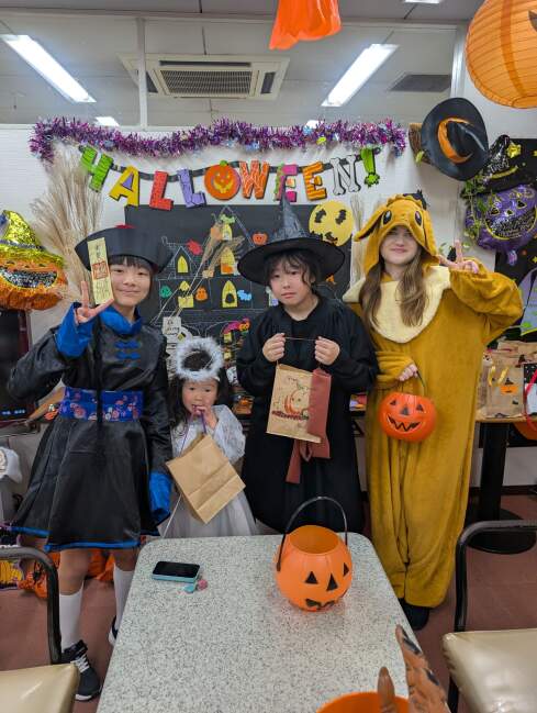 その後ろには生徒さんが作ったお化けやコウモリにジャコランタンなどが貼られています!怖い~と言うより可愛いですね~。みんな毎回この時期はクラスに来るのが英会話プラスにクラフトなので楽しみです!最終日にはハロウィンパーティもありますよ!